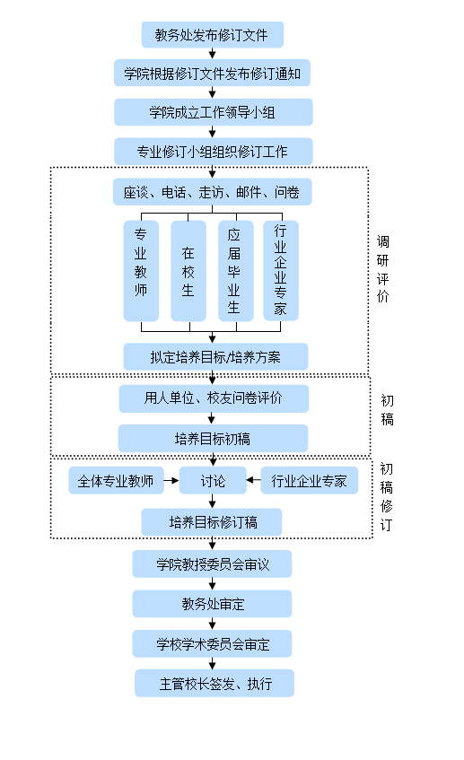 (6)专业负责人组织专业培养目标修订组,依据行业、企业专家、同行专家提出的修改意见,完成培养目标(培养方案)修订稿。