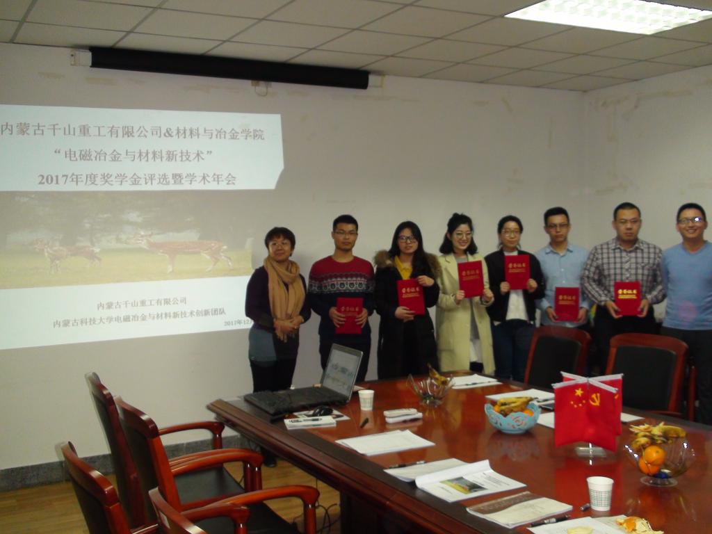 2017年12月27日,由内蒙古千山重工有限公司和永利官网电磁冶金与材料新技术创新团队共同举办了“电磁冶金与材料新技术”2017年度奖学金评选暨学术年会。会议主要分为特邀专家主题报告和研究生工作汇报。本次会议特邀包头市稀土永磁电机有限公司张继鹏总经理、包头铝业高工郭有军、内蒙古北方重工高工郭采光、永利官网科技处处长赵增武作了主题报告。此外,内蒙古千山重工有限公司董事长陈延江、材料与冶金学院院长宋希文出席了学术年会。