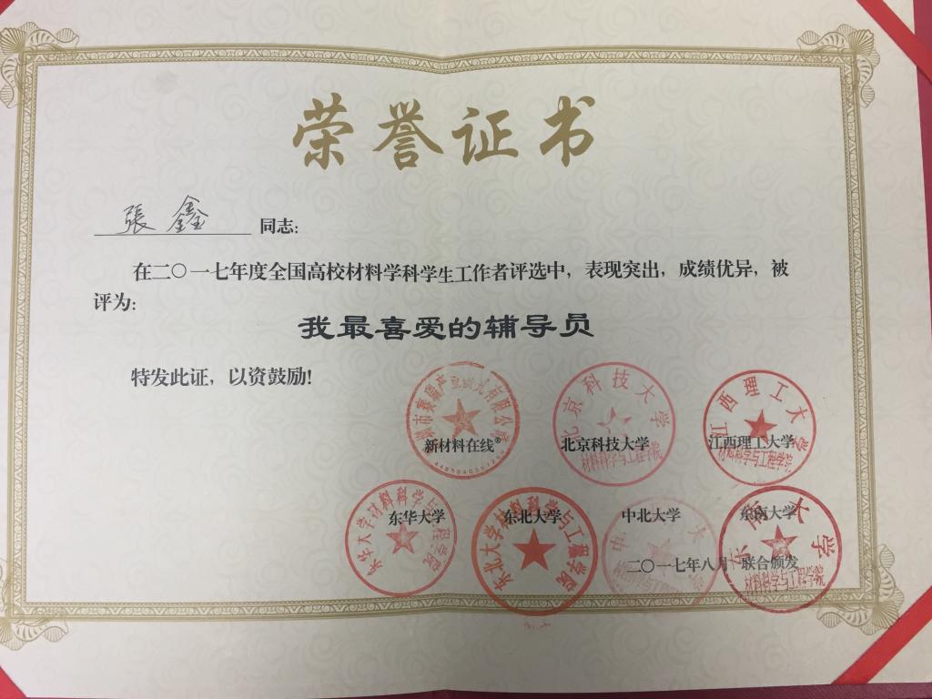 经过广大师生、材料行业人士等为期22天激烈的投票评选, 评选出了2017年度全国高校材料学科“我最喜爱辅导员30强”,我院张鑫老师顺利入围。同时,经过严格筛选评,经过网络投票及为期一周的专家评审环节后,我院张鑫老师荣获2017年度全国高校材料学科“ 十佳学生工作者”。