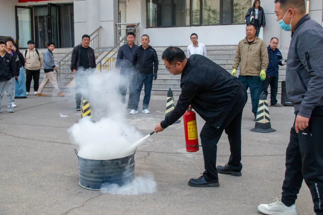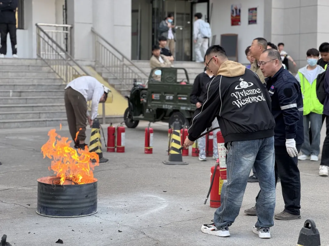 在公开课现场,老师们进行了生动的实践教学。解宇老师现场详细演示干粉灭火器的使用方法,分步骤讲解“检查压力表-拔出保险销-对准火源根部喷射”等操作规范。学生们认真观察学习后,与师生代表一同参与实操演练,在老师的指导下现场学习并操作了干粉灭火器的使用方法,基本掌握了器材使用要领。培训过程中,重点对师生们开展灭火器“提、拔、握、压”操作步骤的教学,通过实物演示强化师生对初期火灾扑救要点的掌握,有效提升了大家应对突发火情的实战能力。